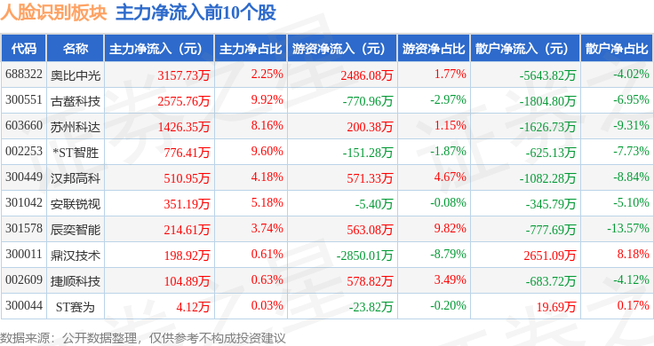 从资金流向上来看,当日人脸识别板块主力资金净流出24.01亿元,游资资金净流入3.25亿元,散户资金净流入20.76亿元。人脸识别板块个股资金流向见下表: