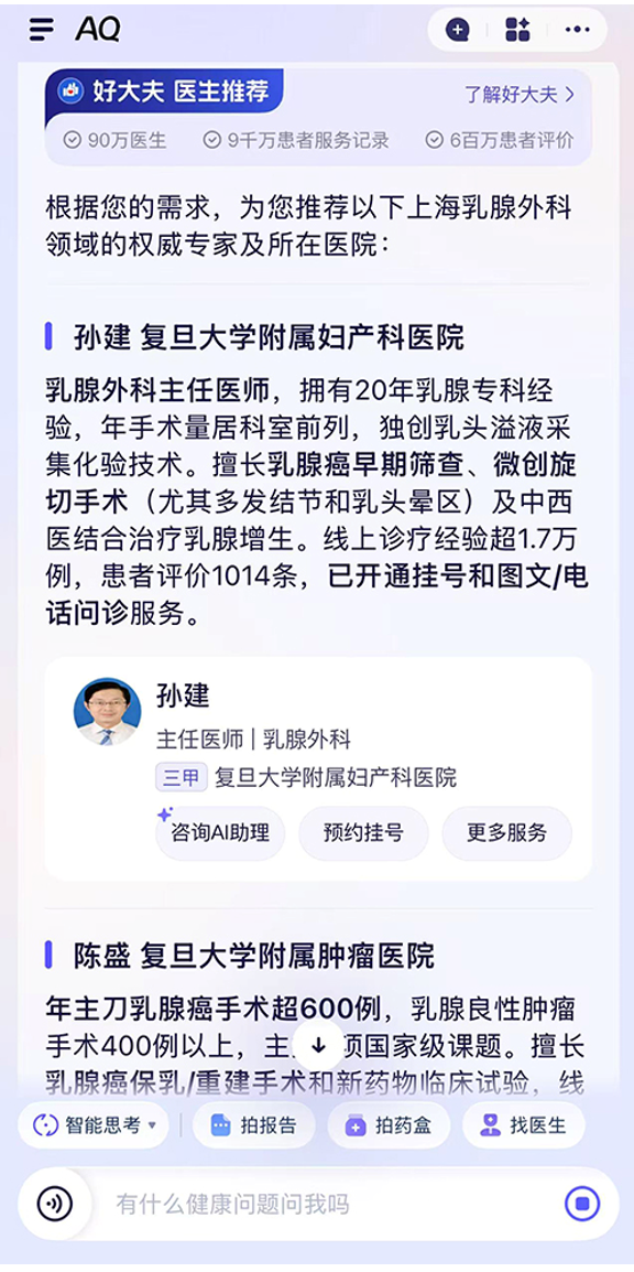 张女士说,因为自己的IP定位在上海,AQ会根据体检报告上出现的健康问题给自己推荐上海的相关医院。“比如针对甲状腺问题,它会推荐我去瑞金医院挂内分泌科,还教我如何挂号;针对乳腺问题,也给我推荐了上海几家比较专业的医院和专家,介绍得很详细,会推动着我把后续的检查落地实施。”