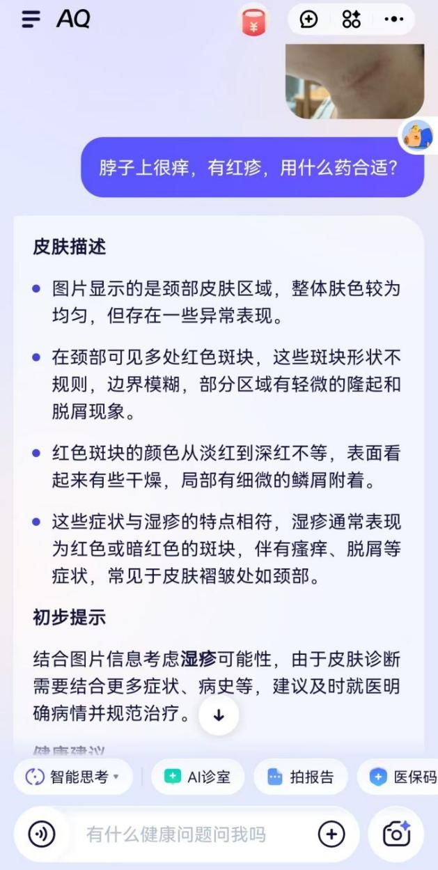 咨询病症时,多数人不知道如何准确表述症状,AQ可模仿真人医生进行追问,一步步引导用户提供必要信息,最终给出更准确全面的健康建议。遇到复杂报告、皮肤问题、药盒、病历等,用户也可以拍照问询。以皮肤拍照为例,AQ能精准分辨50种常见皮肤疾病并提供健康建议。