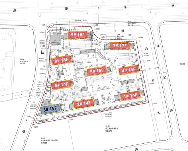 从方案来看,项目多为14-18F的小高层和高层住宅,非人车分流,部分楼栋首层有架空,东面有河道经过,南面规划了一处幼儿园用地(华发代建)。