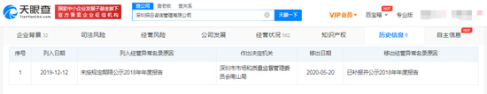 另据天眼查显示,眼神科技的大股东为深圳探日咨询管理有限公司,持股比例为61.45%。该公司的法定代表人同样是周军,参保人数显示为0,2019年12月12日因未按规定提交年度报告信息而被列入企业经营异常名录。